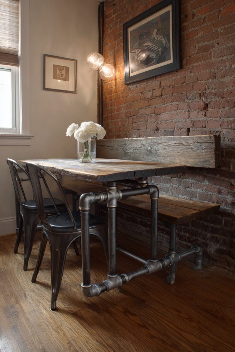 Industrial pipe tables pair beautifully with mixed seating like metal stools, wooden benches, or even upholstered chairs for an eclectic, collected-over-time aesthetic.
