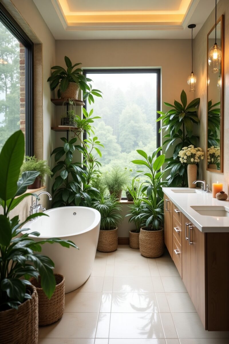 Plant selections that thrive in humid, indirect light conditions add life while creating a natural privacy screen near windows.