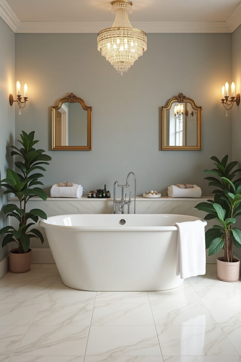 Objects that reference water – like a small tabletop fountain or wave-inspired sculpture – reinforce the bathroom’s connection to this element.