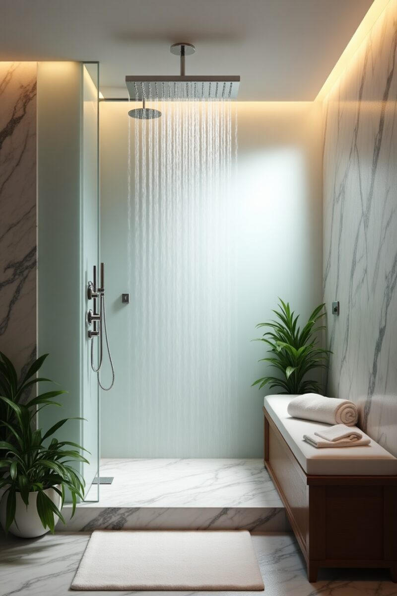 For the ultimate experience, pair your rainfall shower with body jets positioned at different heights along the wall for a full-body massage effect.