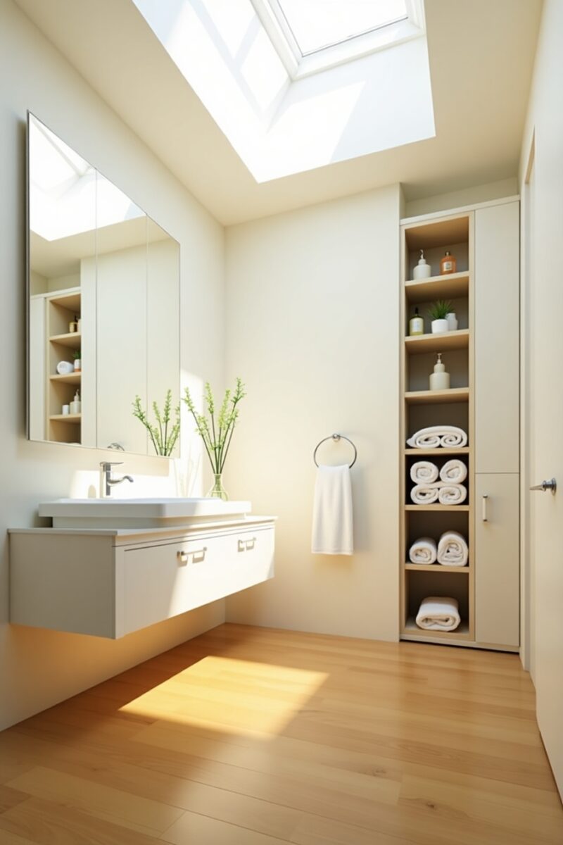 Light tubes or solar tubes can channel sunlight from your roof down into windowless bathroom spaces, providing natural illumination without traditional windows.