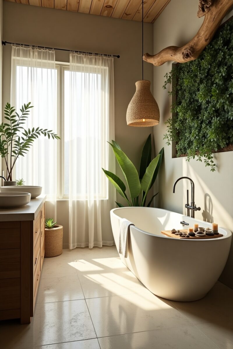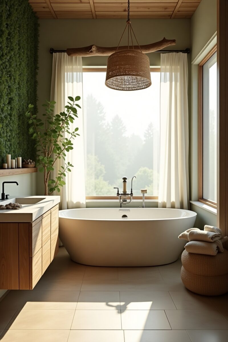Consider incorporating a wooden bath mat, stone countertops, or bamboo accessories for an instant connection to nature.