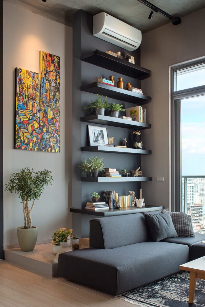 Floating shelves appear to hover on walls, creating storage without the visual weight of traditional bookcases.
