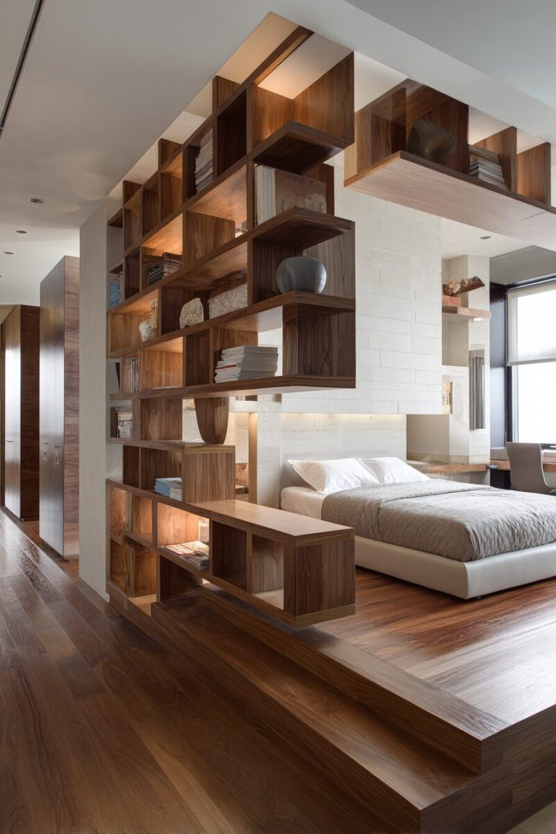 Bookshelf room dividers serve double duty by providing storage while creating visual separation between your sleeping and living areas.