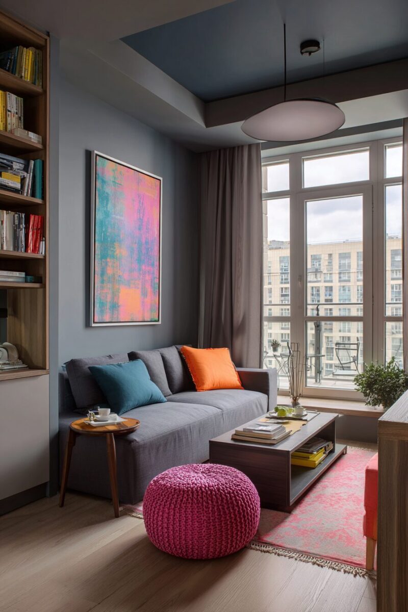 Strategic pops of bright color in accessories and artwork add personality without overwhelming your small space.