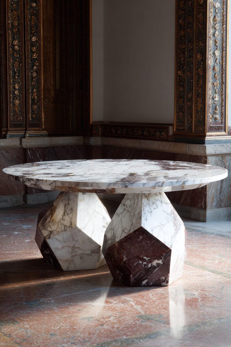 You have the option to create contrast by pairing a heavily veined marble top with a clean, minimalist geometric base, or go for harmony by echoing the marble’s patterns in the base design.
