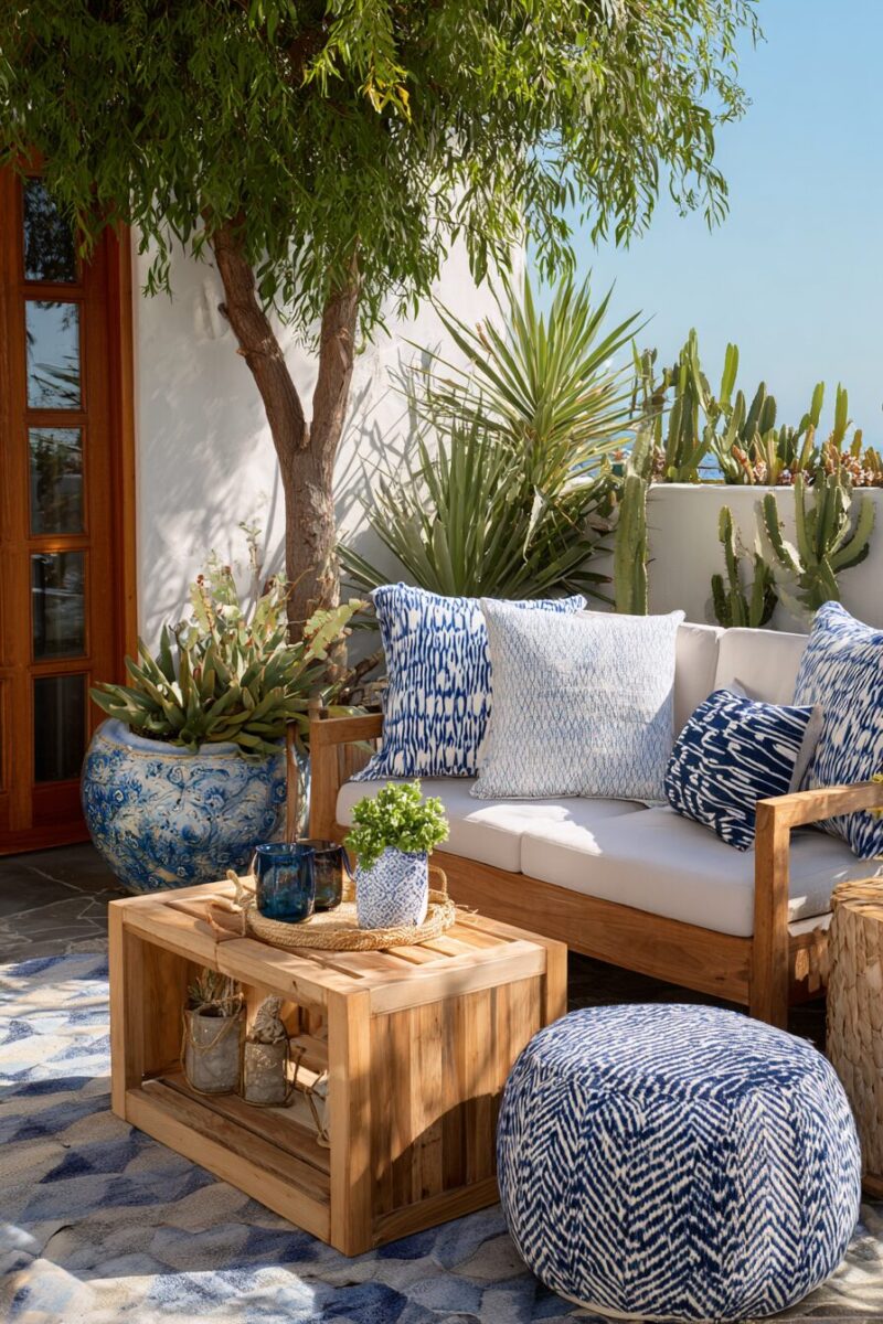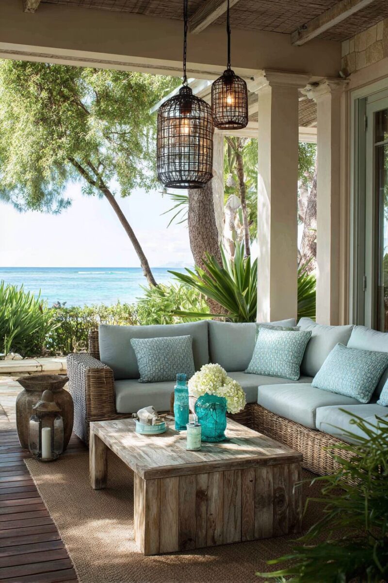 Modular furniture works wonders for coastal patios, allowing you to reconfigure your setup based on whether you’re hosting a dinner party or just lounging with a good book.