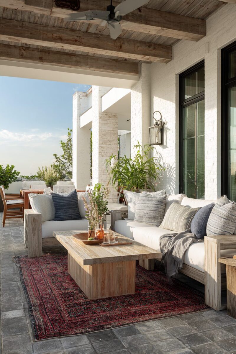 Layering different textures creates visual interest – think smooth canvas pillows next to chunky knit throws and sisal or jute rugs.