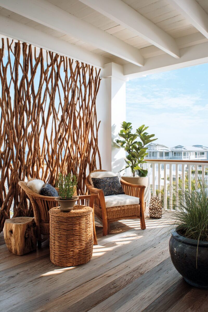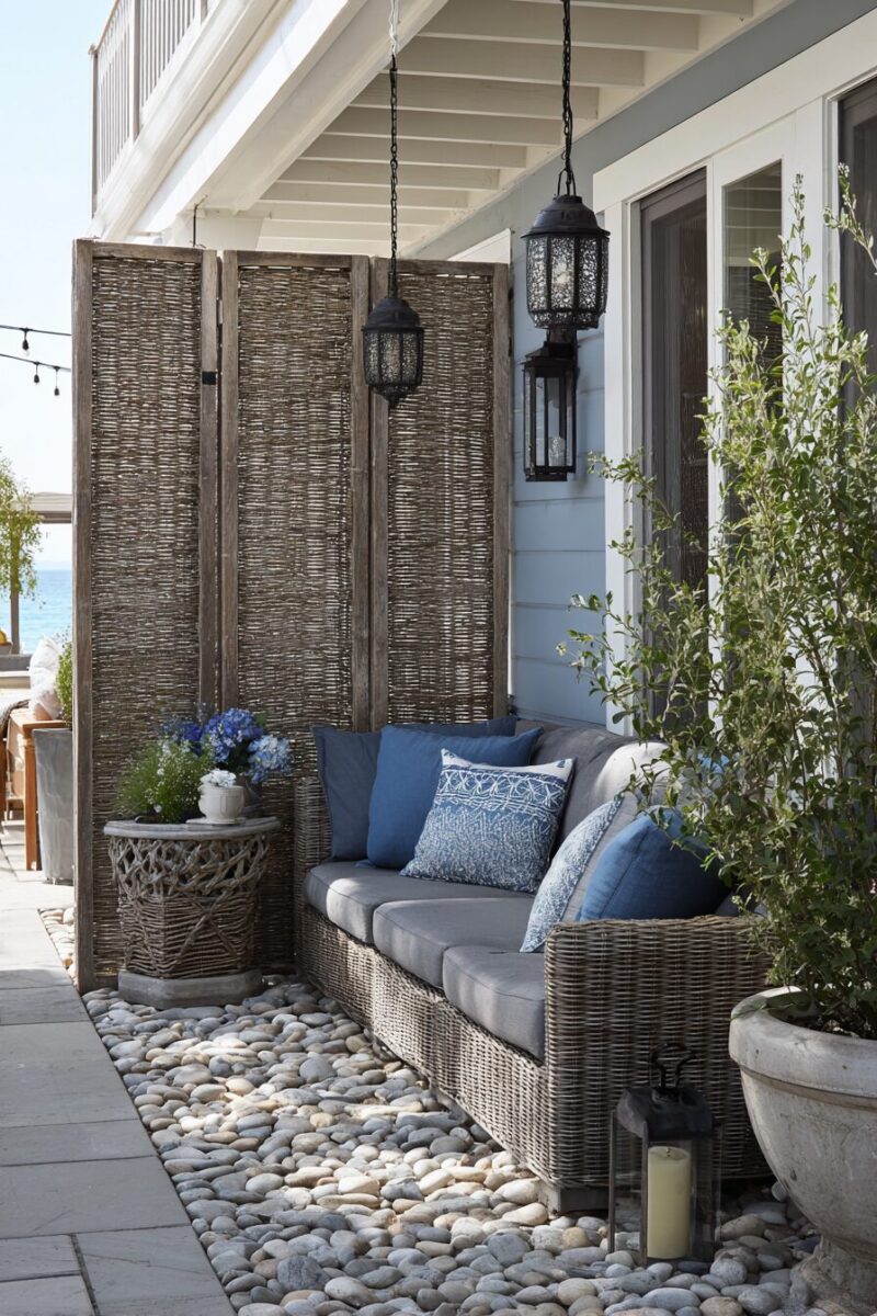 For a more substantial option, consider weather-resistant wooden slat screens painted in white or weathered gray to evoke the feeling of beach boardwalks.