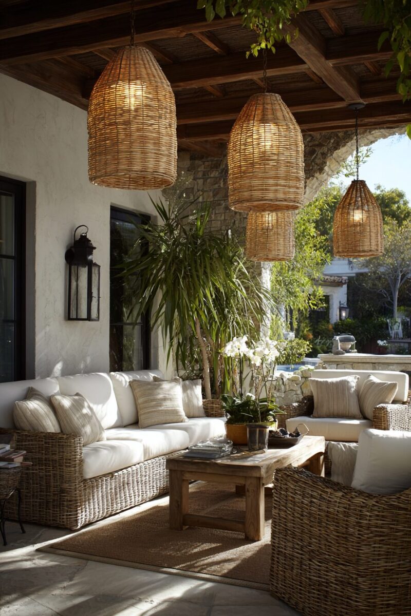 For a more modern coastal approach, look for curved rattan pieces that mimic the organic shapes of waves and pair them with crisp white cushions for that fresh, clean look.