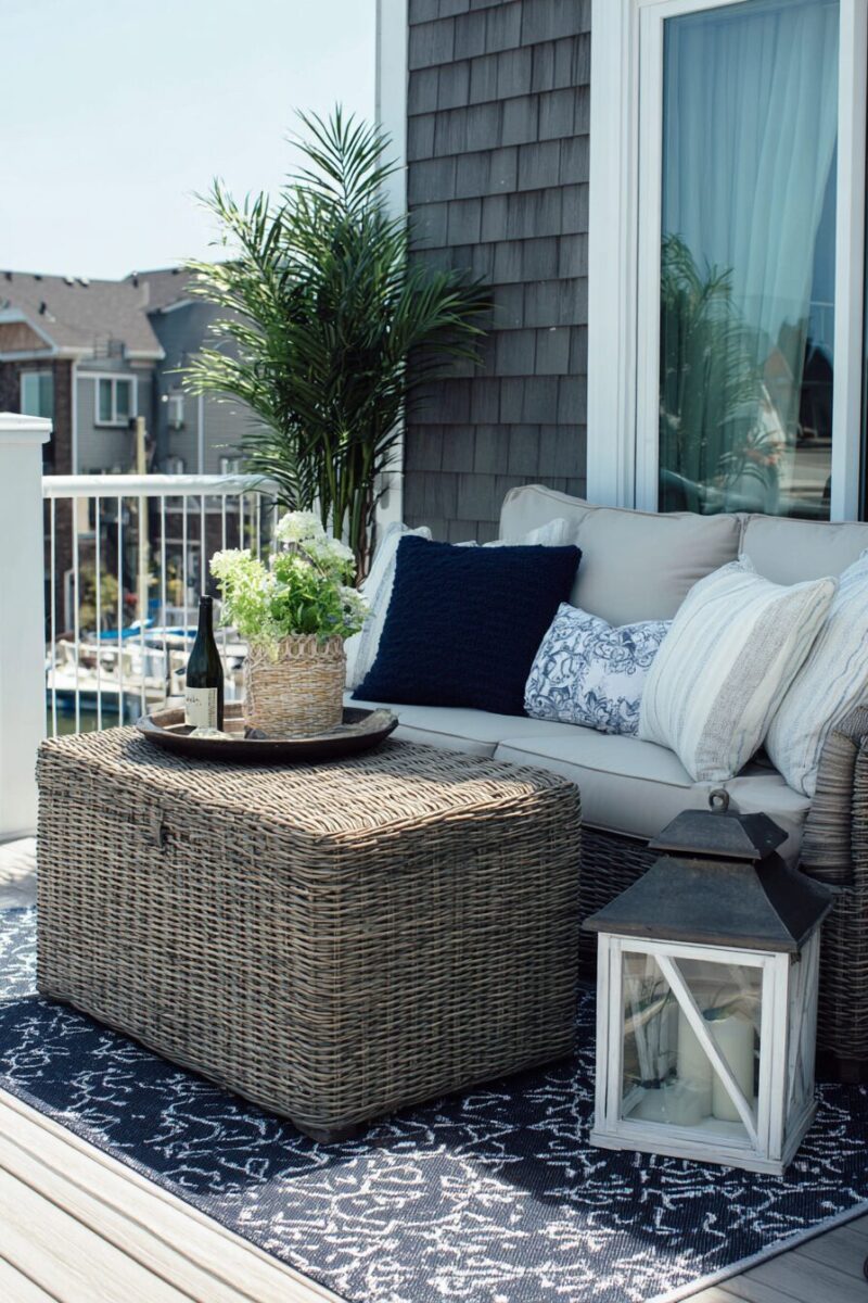 Outdoor rugs in blue and white stripes or geometric patterns can define your seating area while bringing in classic coastal style underfoot.