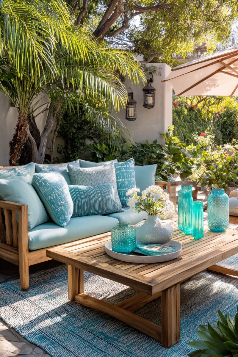 Don’t forget smaller accessories like waterproof storage bins in rope or rattan textures, outdoor-safe art pieces featuring coastal themes, and weatherproof table linens in colors that complement your overall scheme.