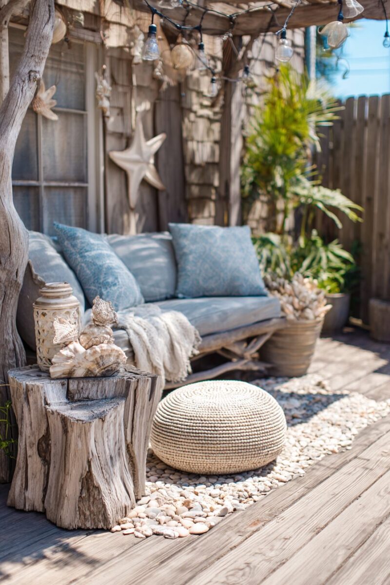 Nautical rope details on pillows, pouf ottomans, or even as decorative elements wrapped around planters add authentic seaside texture.