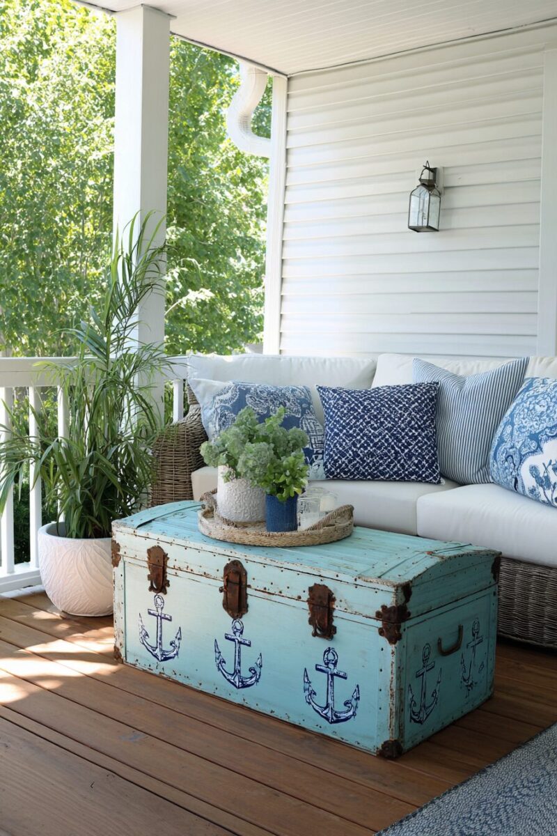 Consider deck boxes made from marine-grade materials and customized with rope handles or nautical blue and white stripes.