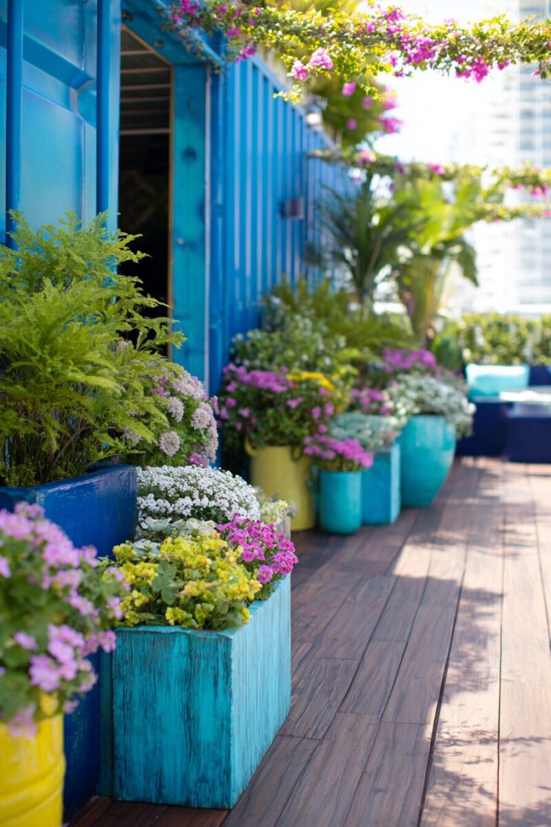 Opt for blue or turquoise glazed pots, whitewashed wooden containers, or rope-wrapped planters to enhance the seaside theme.