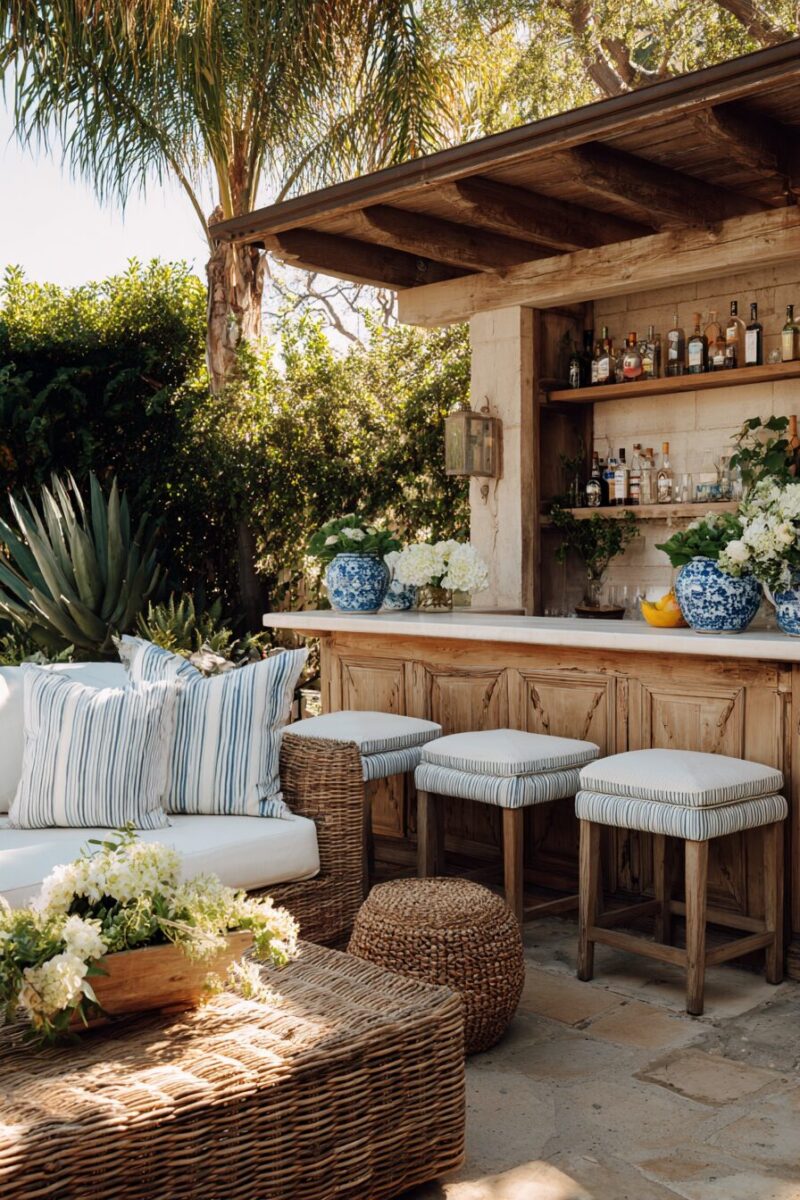 No coastal patio is complete without a designated space for mixing drinks and entertaining friends against a backdrop of ocean-inspired design.