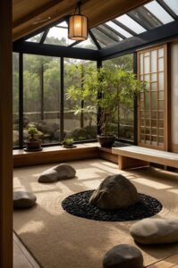 Add cozy seating, storage accents, and a water feature for restful ambiance.