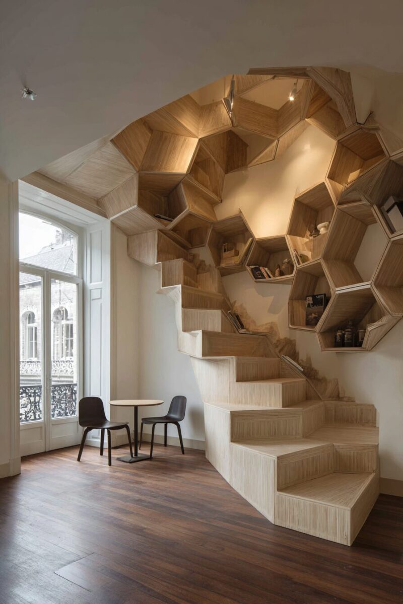 Staircases repurposed as bookshelves or display spaces transform transitional architecture into functional sculpture.