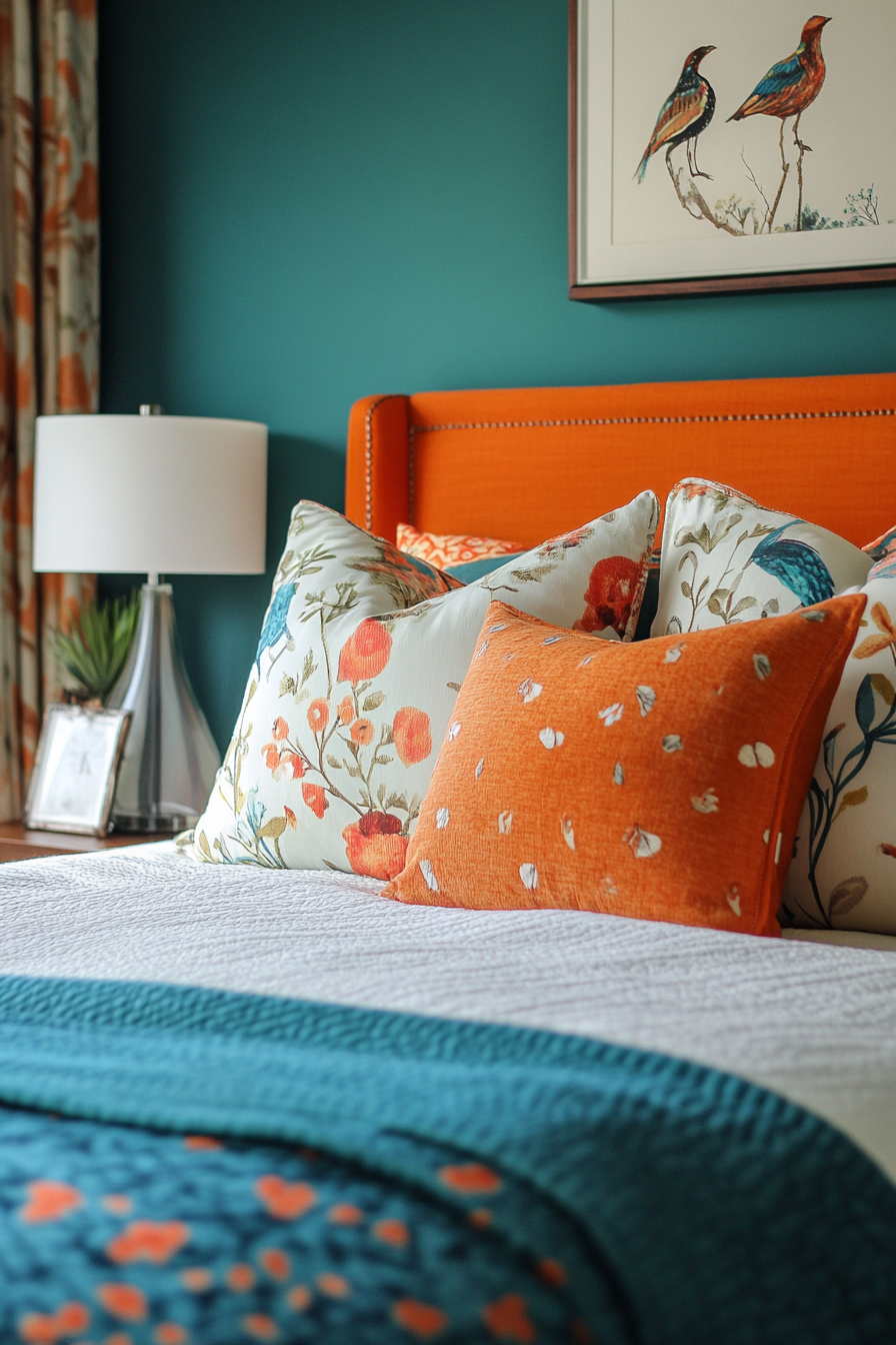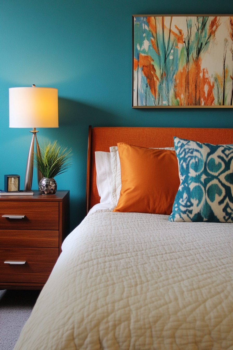 Vibrant Teal Headboard Wall with Orange Accents