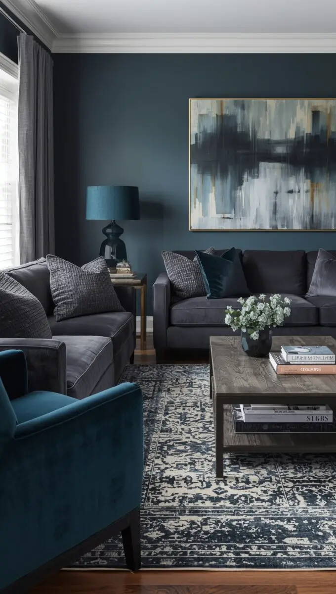13 Industrial Living Room Ideas!7. Go Moody With Dark Teal and Charcoal