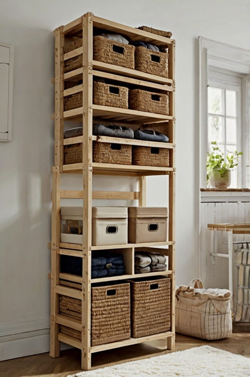 Adding baskets or boxes to your vertical shelves keeps smaller items corralled and maintains a tidy appearance.