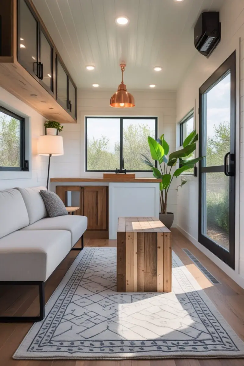 In an open-concept tiny house, defining different zones helps the space feel organized and intentional.