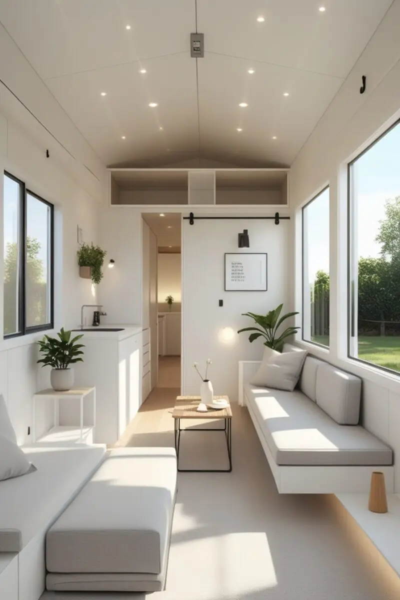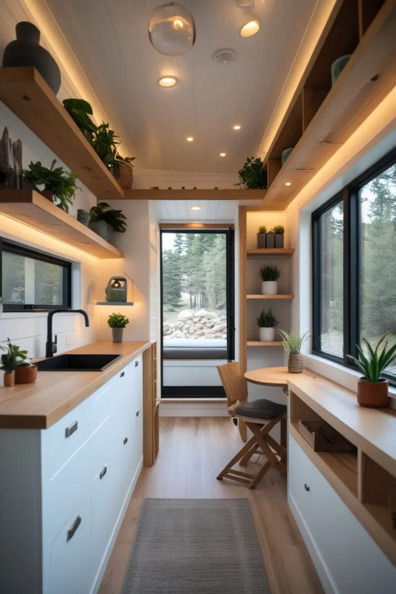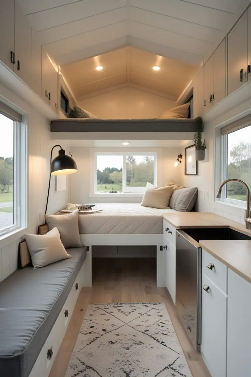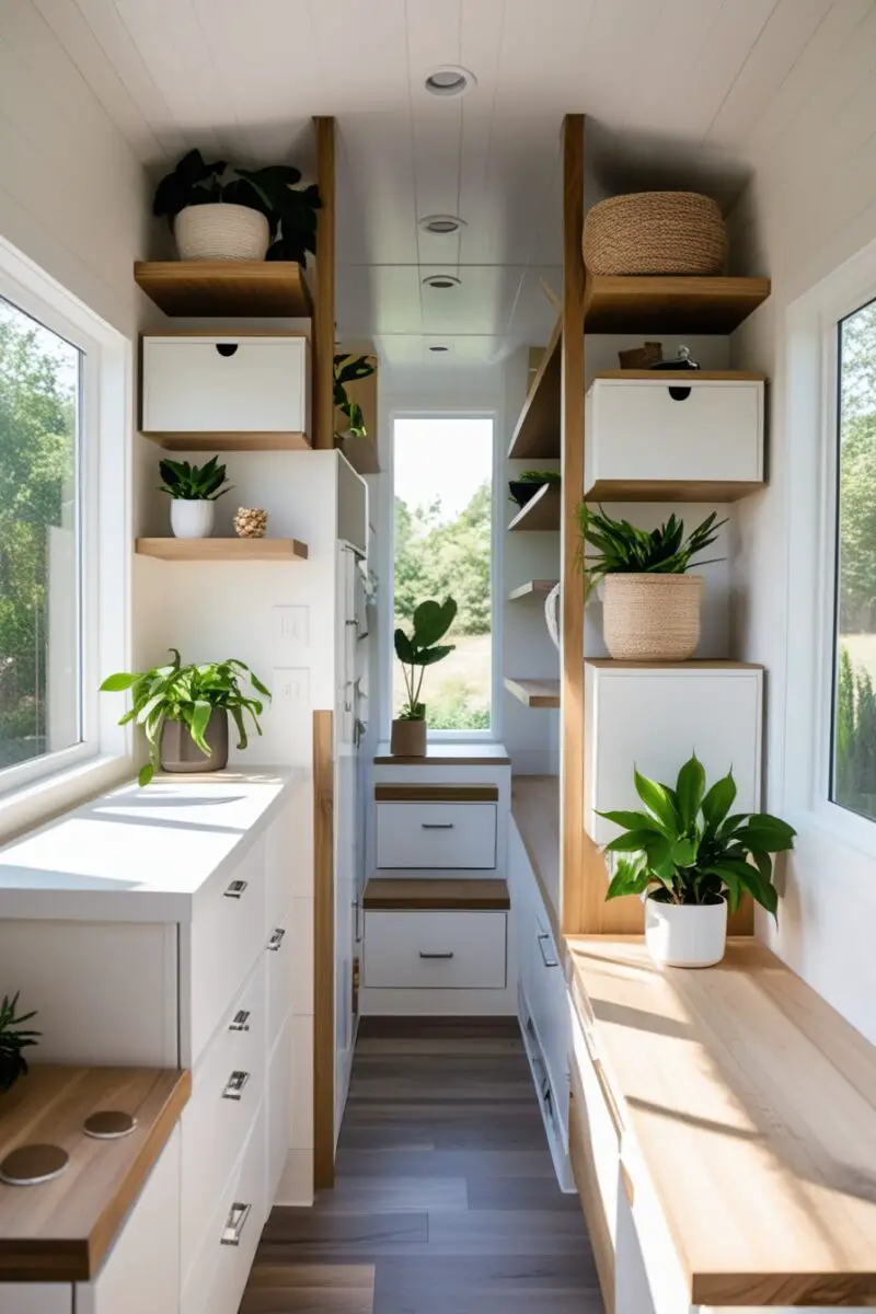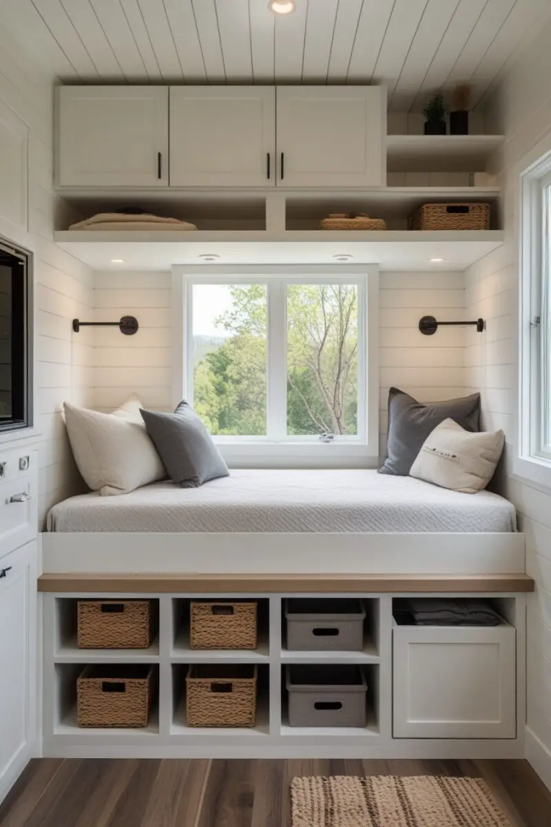 Built-in desks, window seats, and closet organizers make your tiny house feel custom and intentional.