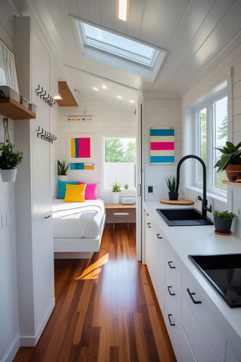 Stick to a cohesive color palette throughout your tiny house to avoid a chaotic, cluttered feel.