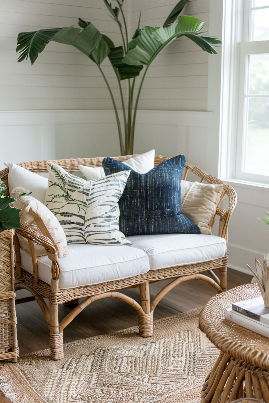 Rattan and wicker immediately set the foundation for a tropical living room.