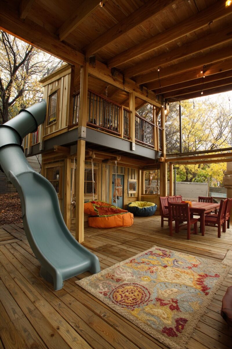 The deck overhead creates natural boundaries while providing protection from sun exposure during extended outdoor play sessions.