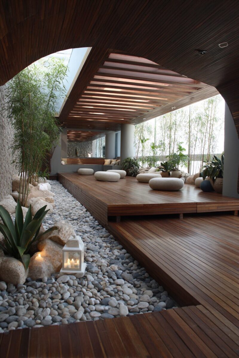 Surrounding the spa with natural materials like bamboo screens, river rocks, and wooden decking enhances the zen-like atmosphere.