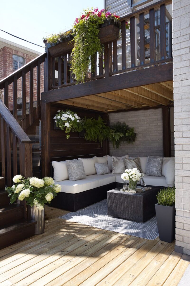 Hanging baskets suspended from the deck joists create layers of greenery at different heights throughout the space.