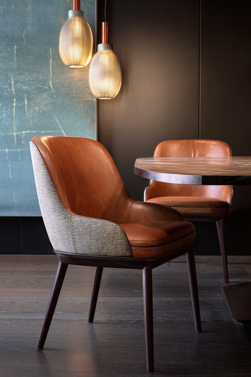 The proportion of leather to fabric affects the chair’s overall personality – leather-dominant chairs feel more masculine and formal, while fabric-dominant pieces with leather accents feel softer and more approachable.