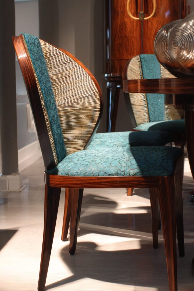 The back of your dining chair offers prime real estate for architectural details that can transform ordinary seating into sculptural art pieces.