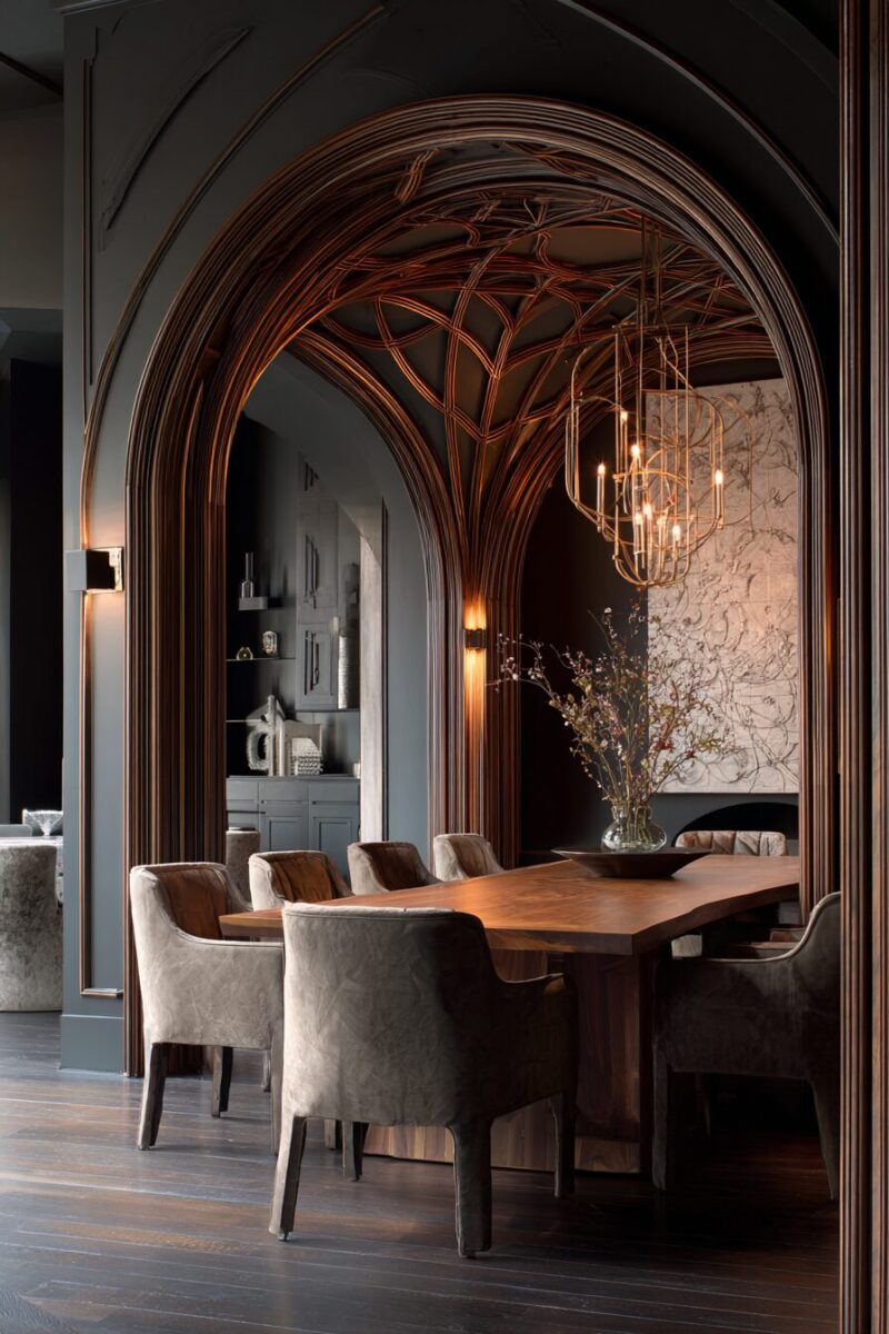 You’ll discover that dramatic chair backs create beautiful silhouettes that make your dining room look more expensive and thoughtfully designed, even when viewed from other rooms in your home.