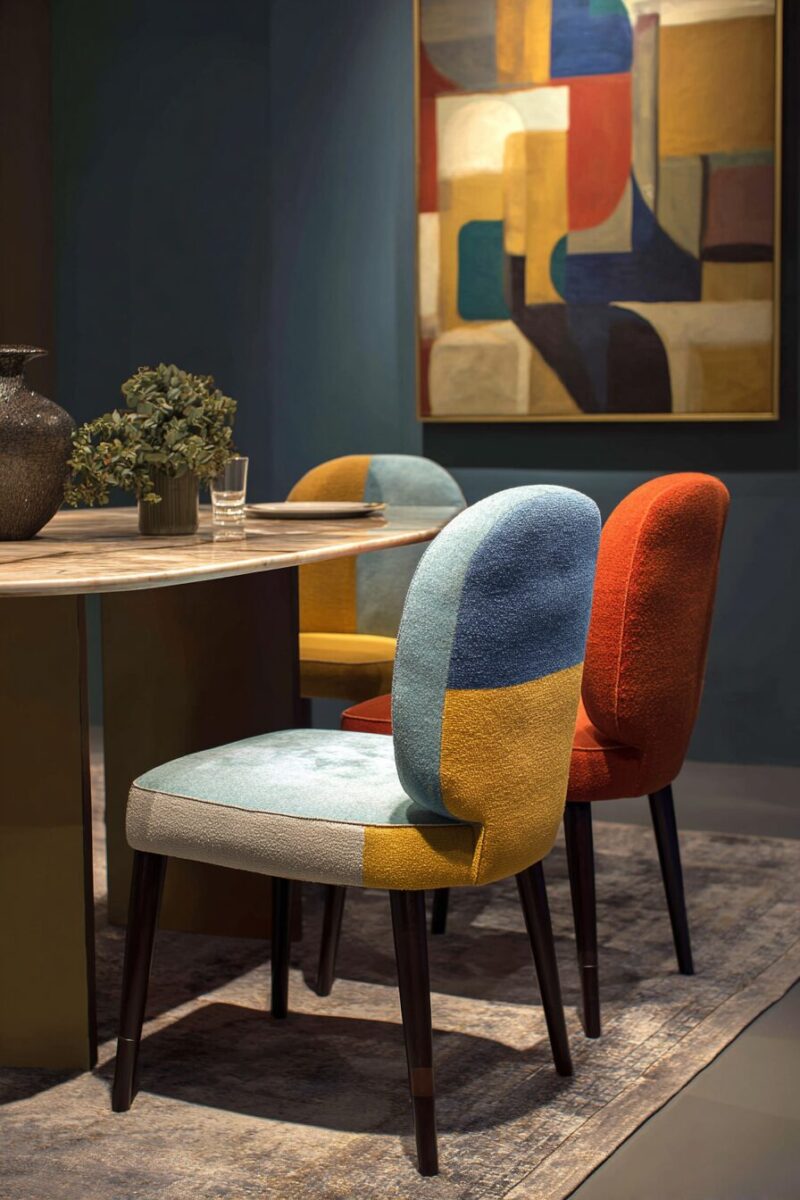 Color blocking on dining chairs creates a bold, contemporary look that instantly modernizes any dining space without requiring a complete room renovation.