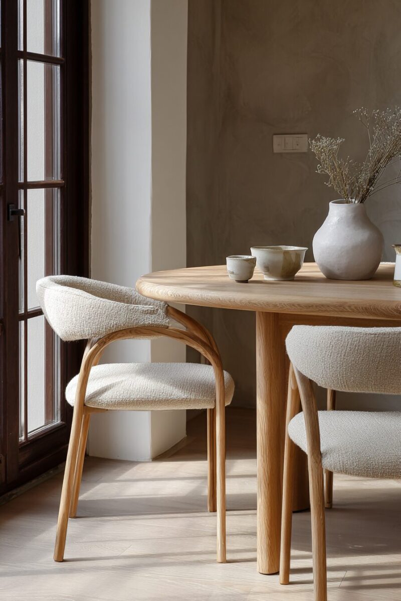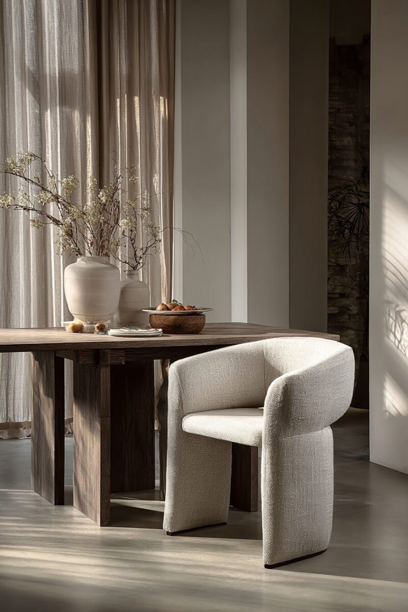 Minimalist linen chairs pair beautifully with natural wood tables, creating an organic, earthy combination that feels both contemporary and timeless.