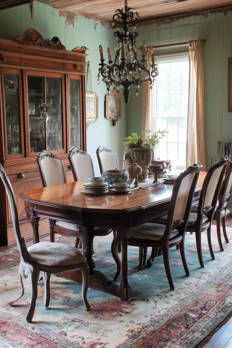 A charming china cabinet is a timeless centerpiece for a vintage dining room, blending beauty and practicality to create a cozy, inviting atmosphere.