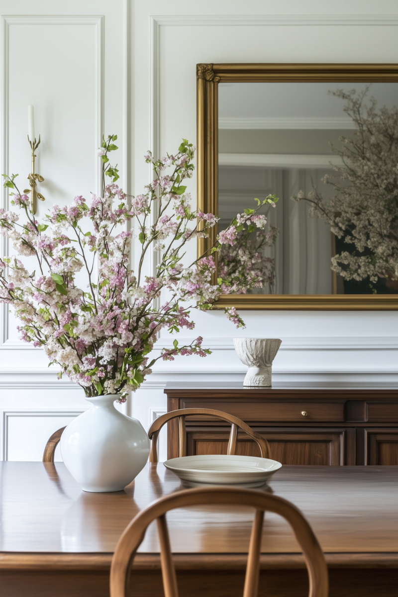 Placing a mirror strategically to reflect natural light or candlelight adds a soft, inviting glow to the dining area.