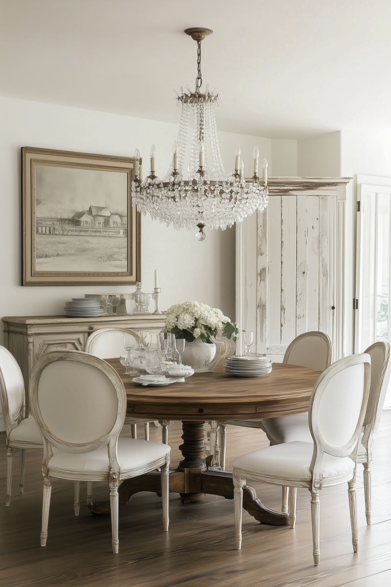 Artwork and mirrors are charming additions to a vintage dining room, bringing warmth, personality, and a sense of history to the space.