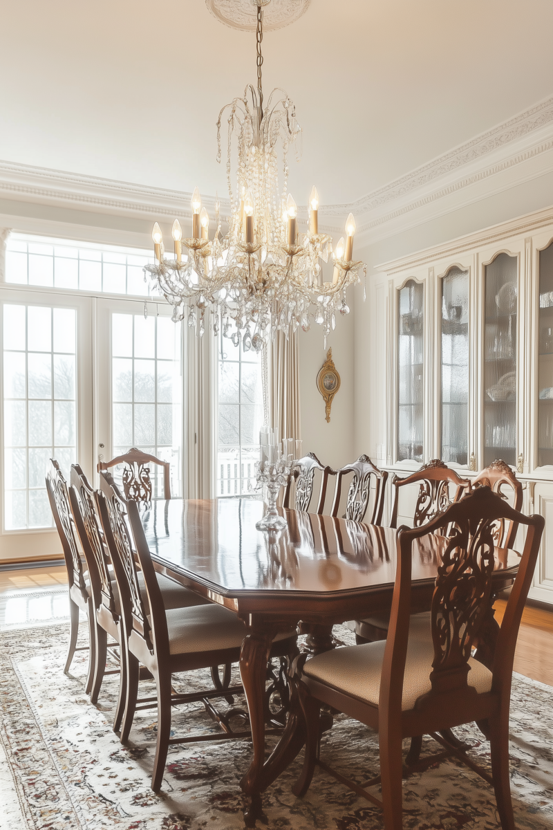 With its timeless design, a chandelier can transform the atmosphere of the space, casting a warm and inviting glow over the dining table.