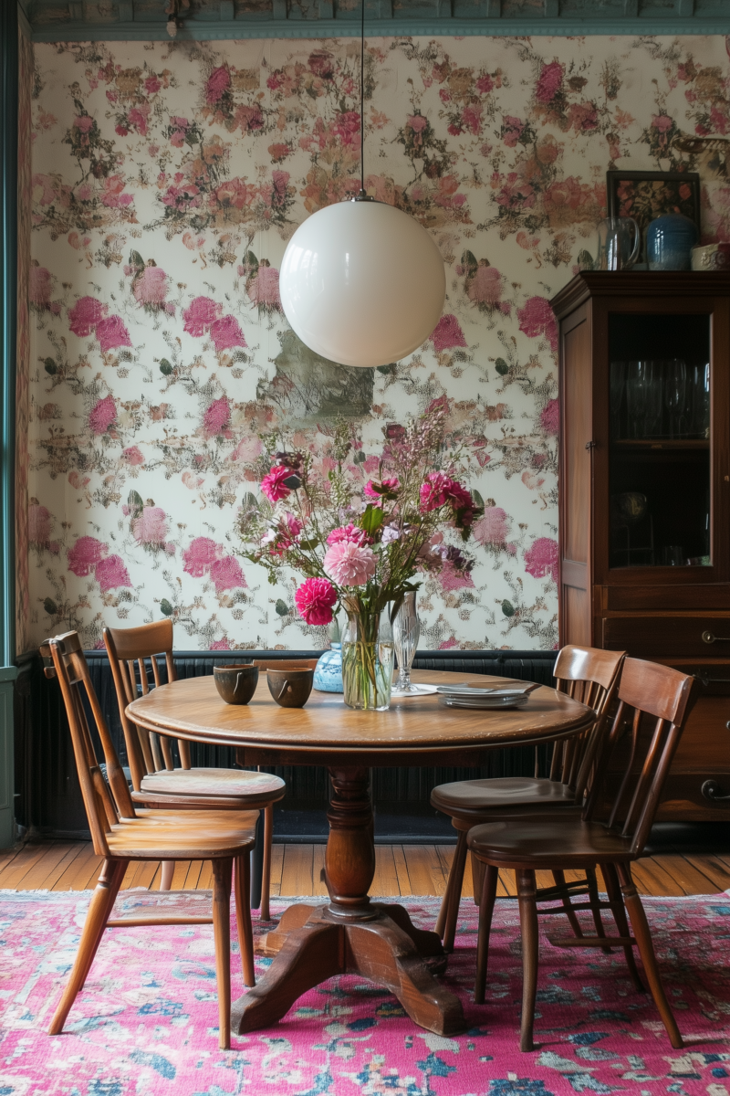 A vintage-inspired wallpaper is a simple yet impactful way to infuse your dining room with cozy charm and timeless appeal.
