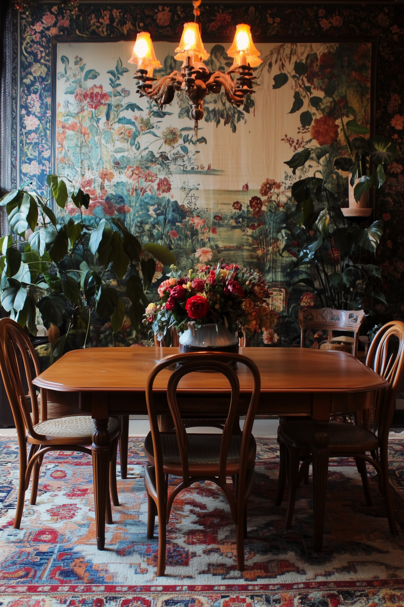 The interplay of patterns and textures in a vintage dining room fosters a relaxed and welcoming environment.