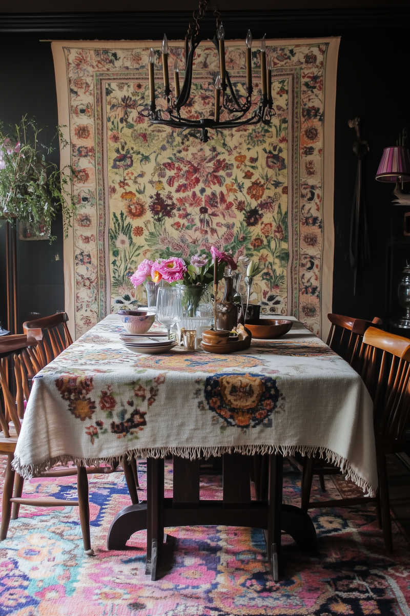 Drape a patterned tablecloth over the table, add a delicate doily under a centerpiece, or place quilted or needlepoint cushions on dining chairs.