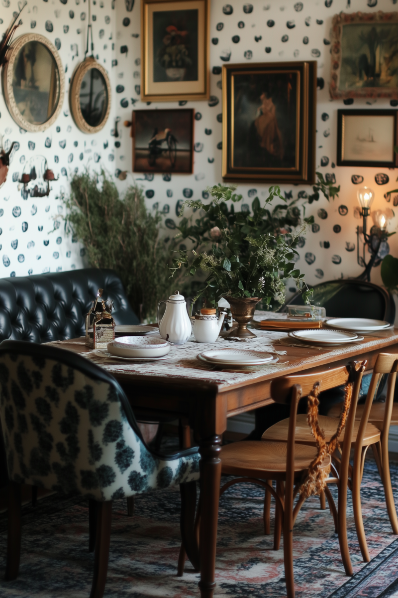 Introduce a mix of materials, such as a worn wooden dining table, plush upholstered chairs, and vintage ceramic dishware.