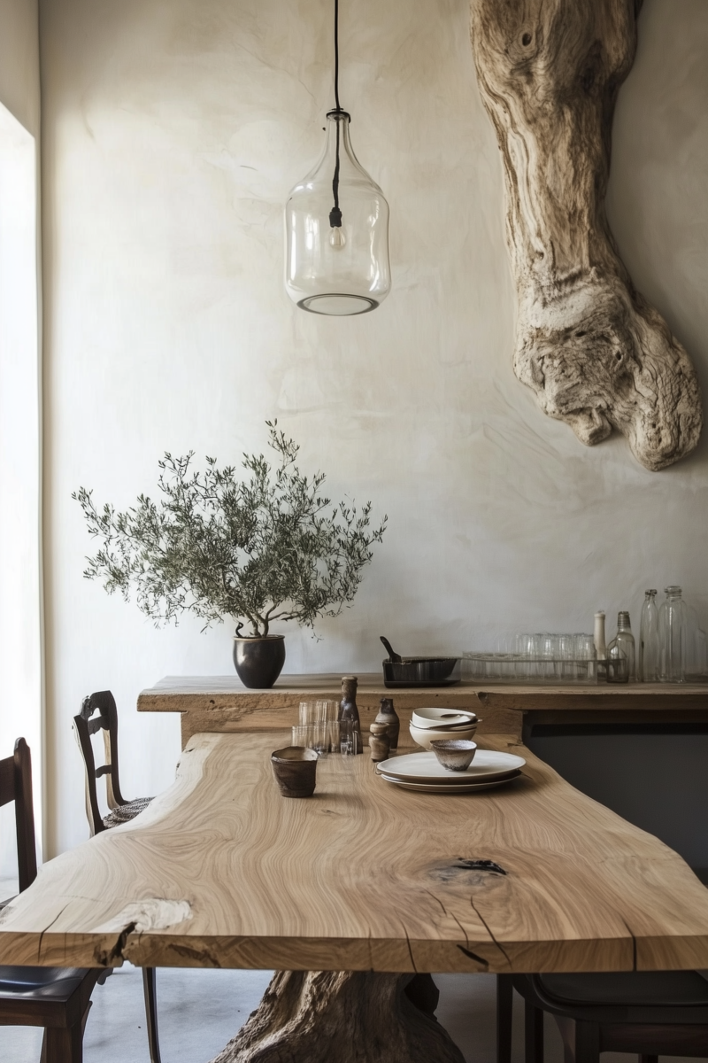 The combination of wood and natural materials not only enhances the room’s vintage aesthetic but also connects the space to nature, creating a serene and timeless dining environment where family and friends will love to gather and share meals.