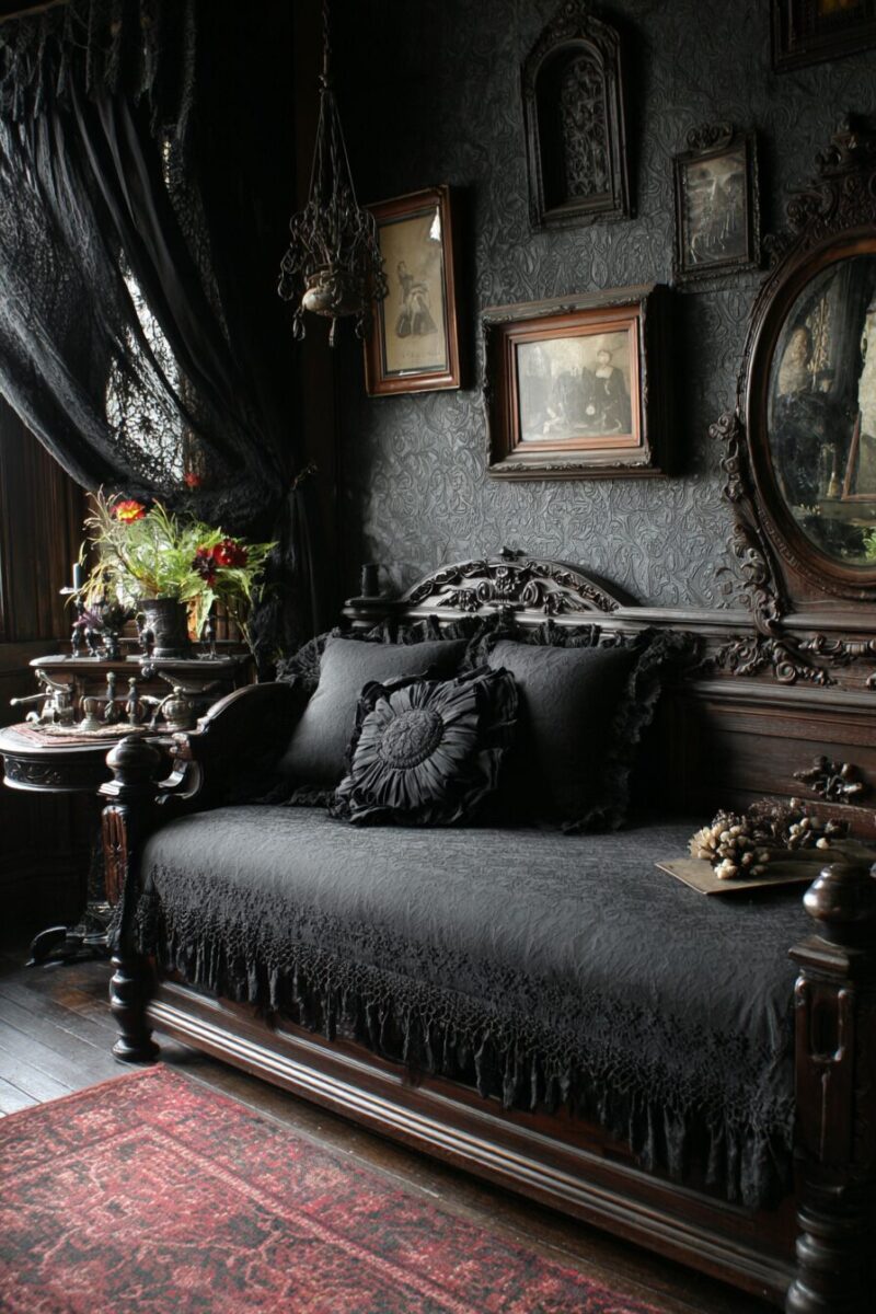 Add fresh or dried flowers in dark vases, as flowers played a crucial role in Victorian mourning rituals and memorial displays.