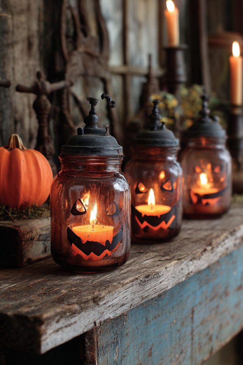 These vintage glass containers become perfect vessels for creating an authentically spooky atmosphere that feels like it’s straight out of a 1940s farmhouse.