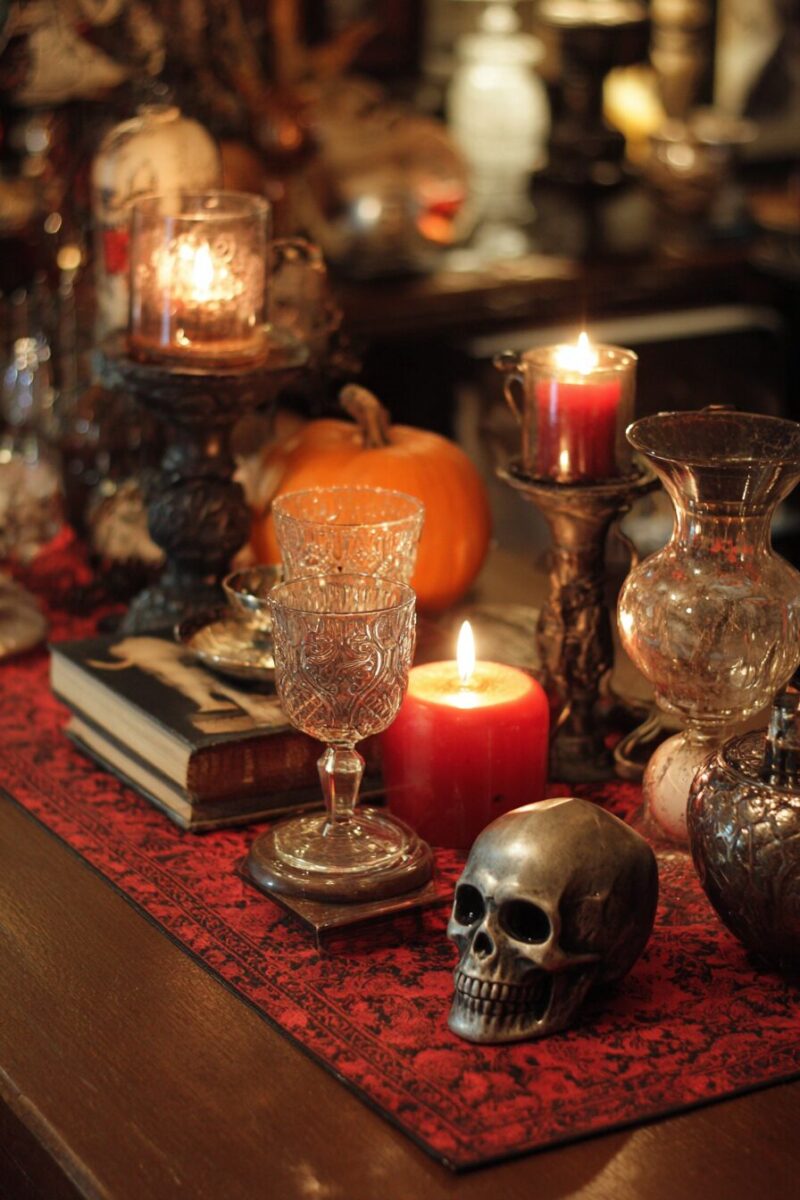 Place a crystal ball at the center as the focal point, surrounded by tall brass candlesticks with dripping white or black candles.