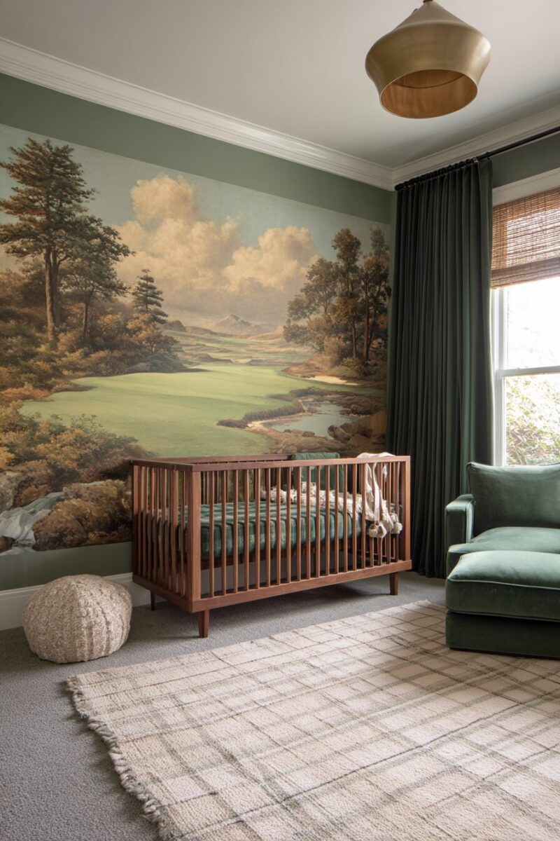 The wall treatment features hand-painted elements that mimic the rolling hills and fairways of vintage golf course landscapes.